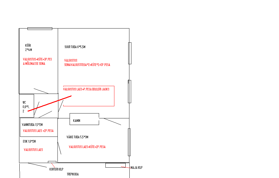 Kadriorus olevas puumajas ,2toalises korteris (+köök+wc+vannituba)vaja vahetada kogu juhtmestik.Eesmärk on minna elektri küttele üle ja ühtlasi ka juhtmestik uuendada.Võimsusega kõik OK.Juhtmete vedu pinna pealselt plastist karbikute ja põrandaliistude(sellised mille sisse saab juhet panna)abil.Esikusse paigaldada kilp millest saab eraldi välja lülitada iga ruumi kütet ja valgust/p.pesad.