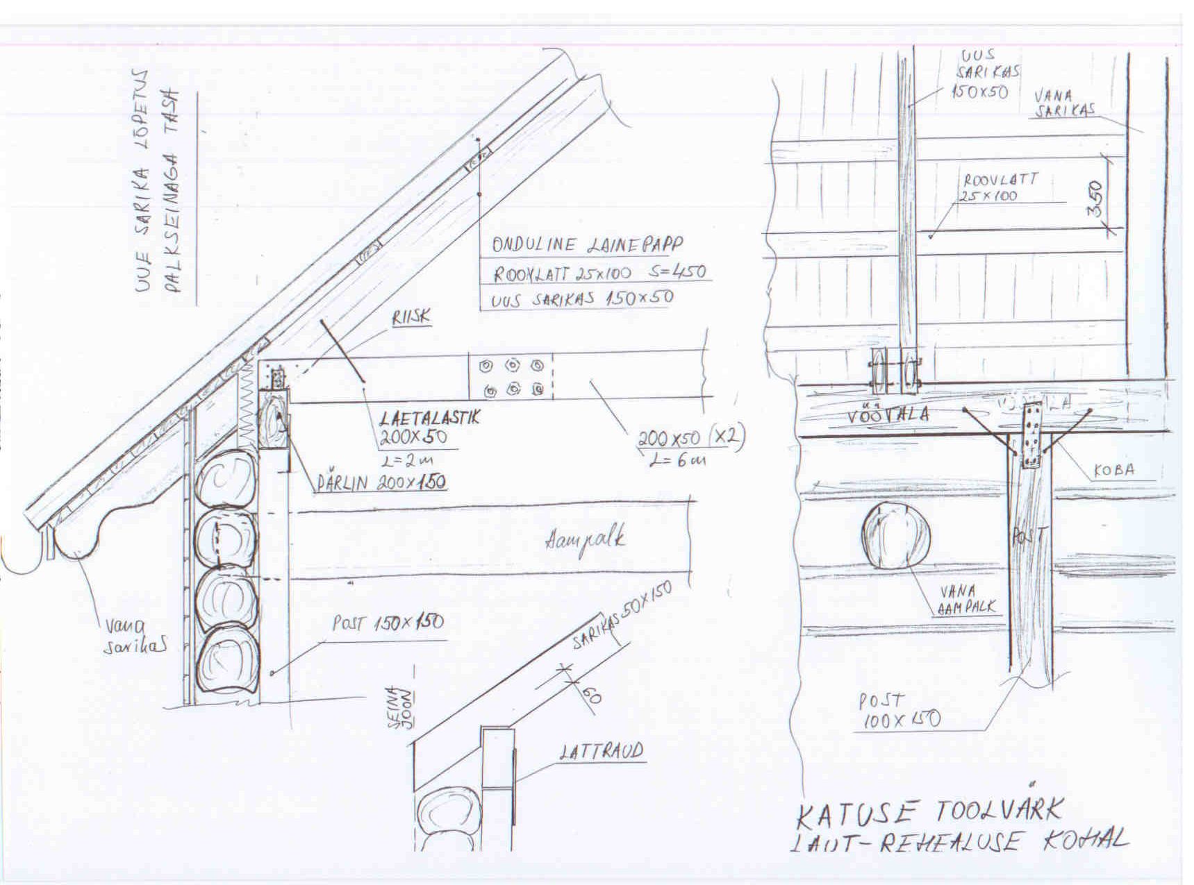 Rehielamu tüüpi hoone katuse uute kandekonstruktsioonide ehitus/vahetus (laut-rehealune), vana katusekatte lammutus (eternii ja laast) koos roovidega, täiendavad uued sarikad, uus roovitus ja katusekate (Onduline).